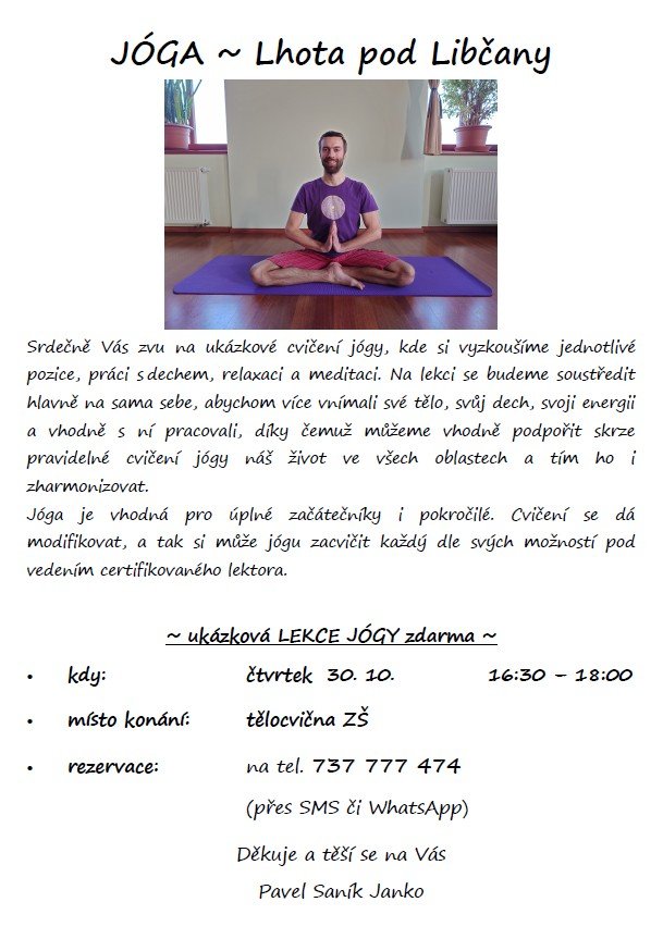 Zveme vás na ukázkovou lekci jógy, která proběhne v tělocvičně ZŠ ve Lhotě pod Libčany ve čtvrtek 30. října 2025 od 16.30 hodin. Podrobné informace ke cvičení a k možnosti přihlášení naleznete v připojeném informačním letáku.