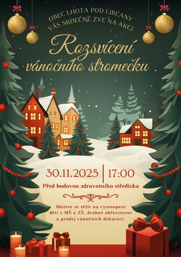 Srdečně vás zveme na tradiční rozsvícení vánočního stromu. Akce se uskuteční v neděli 30. listopadu 2025 od 17.00 hodin u budovy zdravotního střediska ve Lhotě pod Libčany. Podrobnosti naleznete v připojené pozvánce. Těšíme se na vás!
