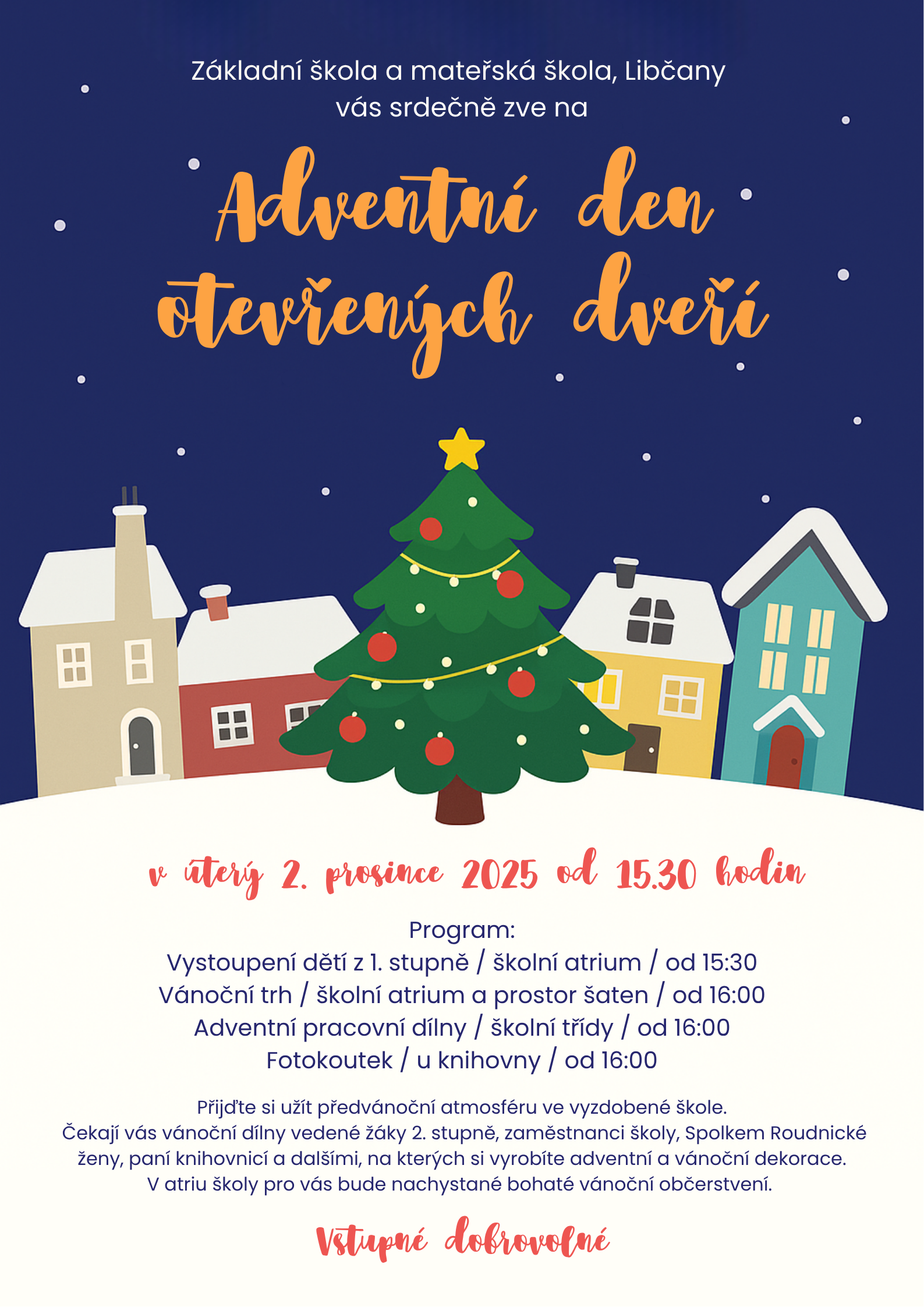 Dovolujeme si vám předat pozvánku ZŠ a MŠ Libčany na tradiční den otevřených dveří, který v budovách školy proběhne v úterý 2. prosince 2025 od 15.30 hodin. Veškeré podrobnosti a program akce naleznete v připojené pozvánce.