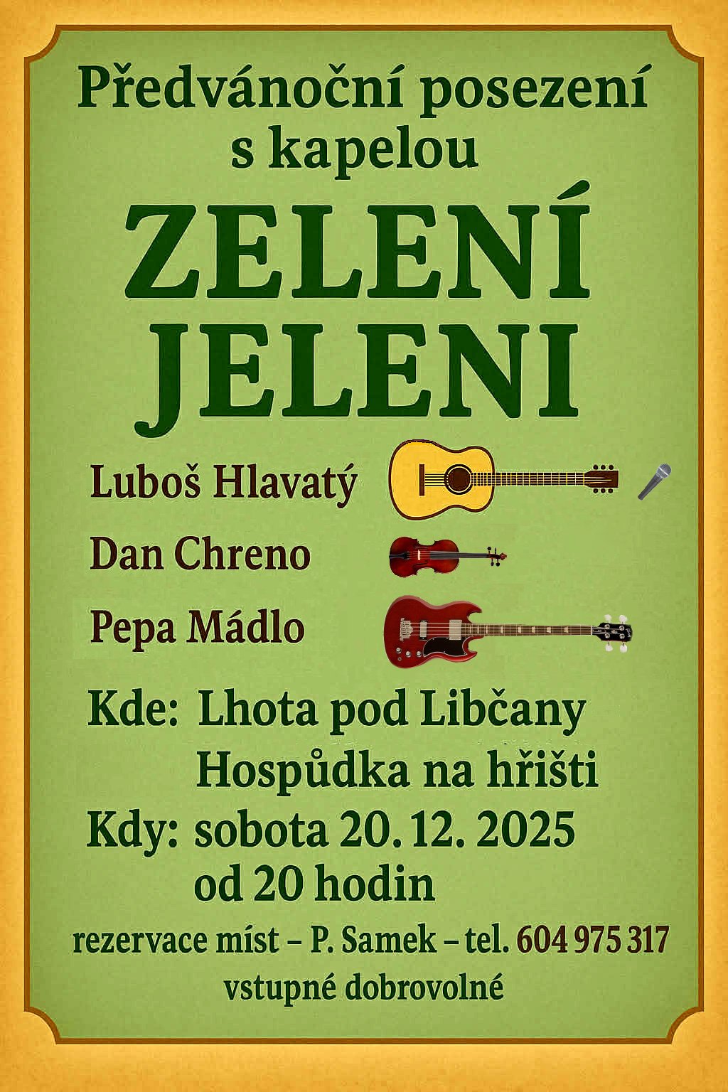 Kapela Zelení Jeleni vás zve na předvánoční posezení s kapelou, které se bude konat v Hospůdce na hřišti v sobotu 20. prosince 2025. Podrobnosti naleznete v připojené pozvánce.