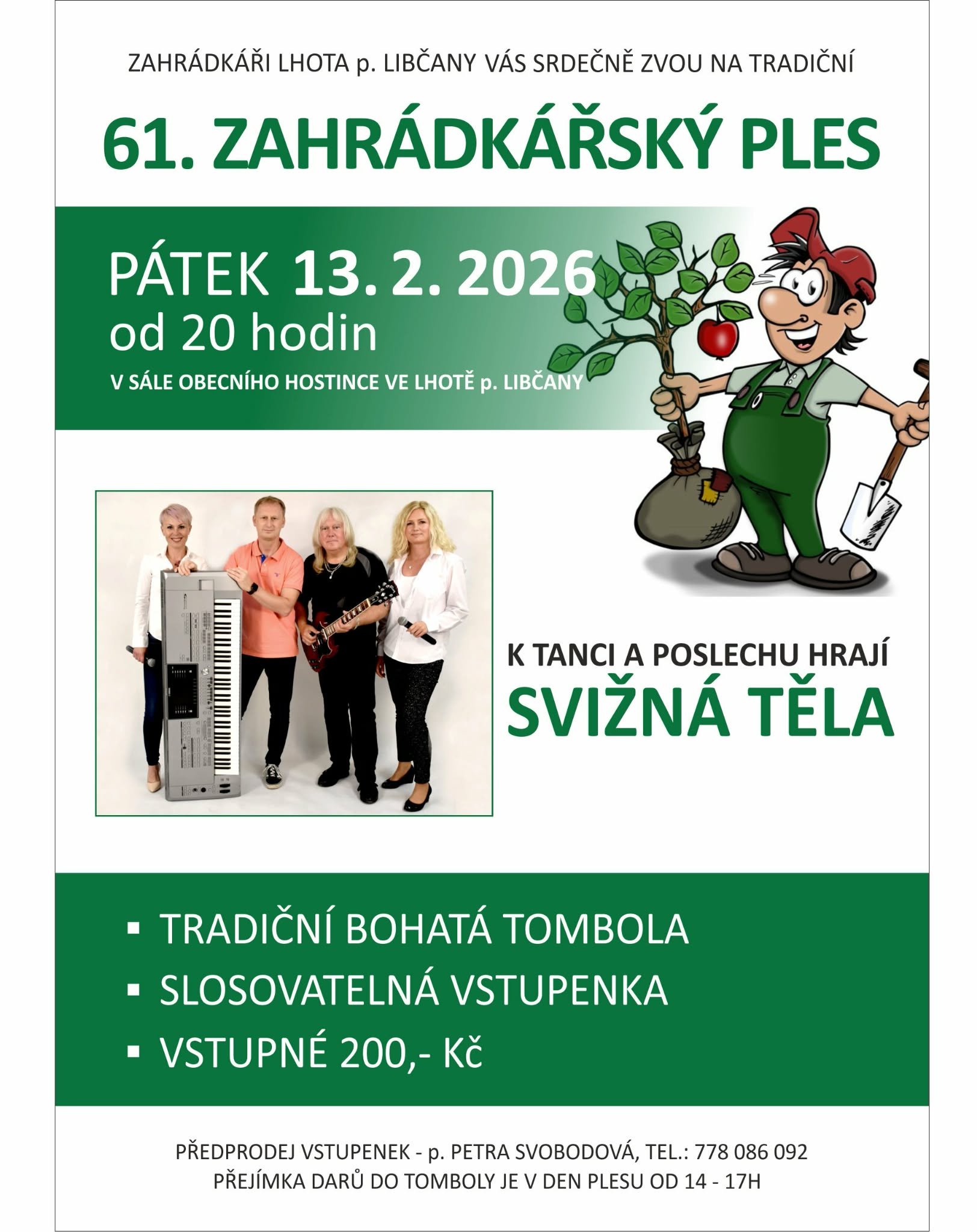 Zahrádkáři ze Lhoty pod Libčany vás srdečně zvou na tradiční Zahrádkářský ples. Akce se bude konat v pátek 13. února 2026 od 20.00 hodin v sále Obecního hostince ve Lhotě pod Libčany. Podrobné informace naleznete v připojené pozvánce.
