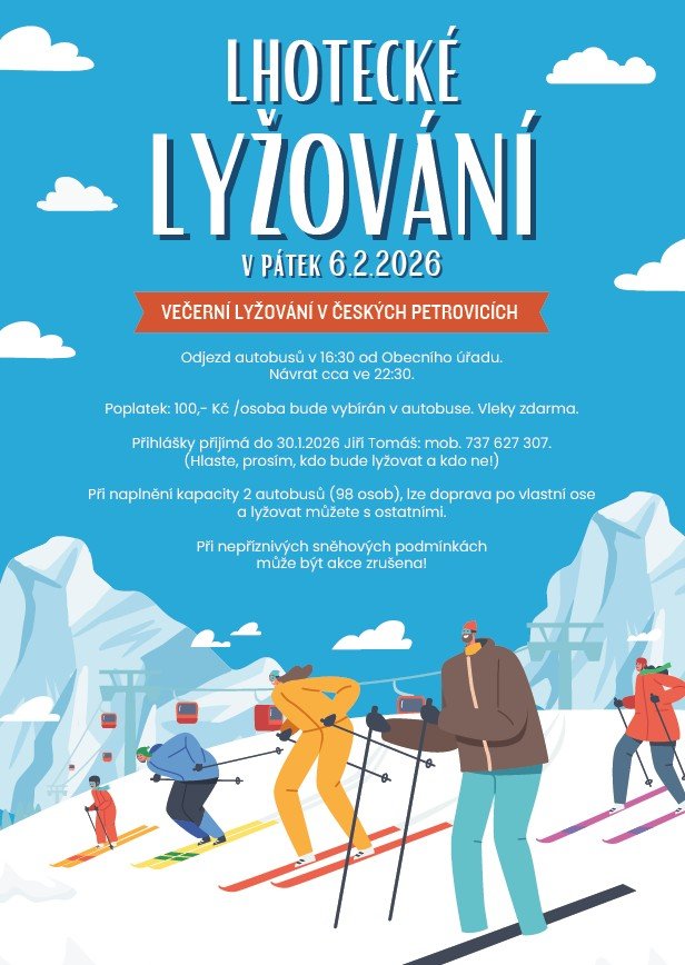 Zveme vás na již tradiční zimní akci Lhotecké lyžování, která se uskuteční v pátek 6. února 2026 v Českých Petrovicích. Informace o čase odjezdu a příjezdu autobusů atd. získáte v připojené pozvánce.