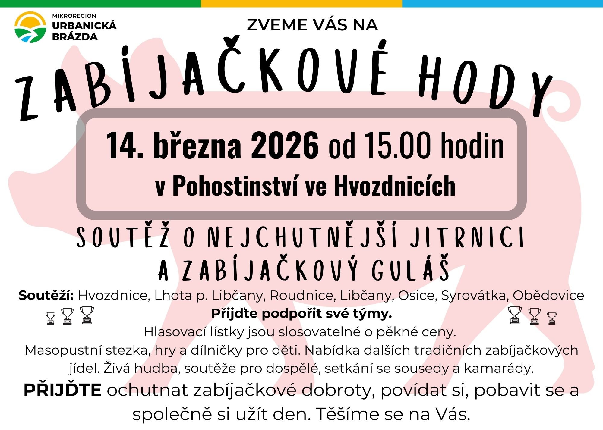 Mikroregion urbanická brázda vás zve na Zabíjačkové hody, které se letos budou konat v Pohostinství ve Hvozdnicích v sobotu 14. března 2026 od 15.00 hodin. Program akce a další podrobnosti najdete v přiložené pozvánce. Všichni jste srdečně zváni!