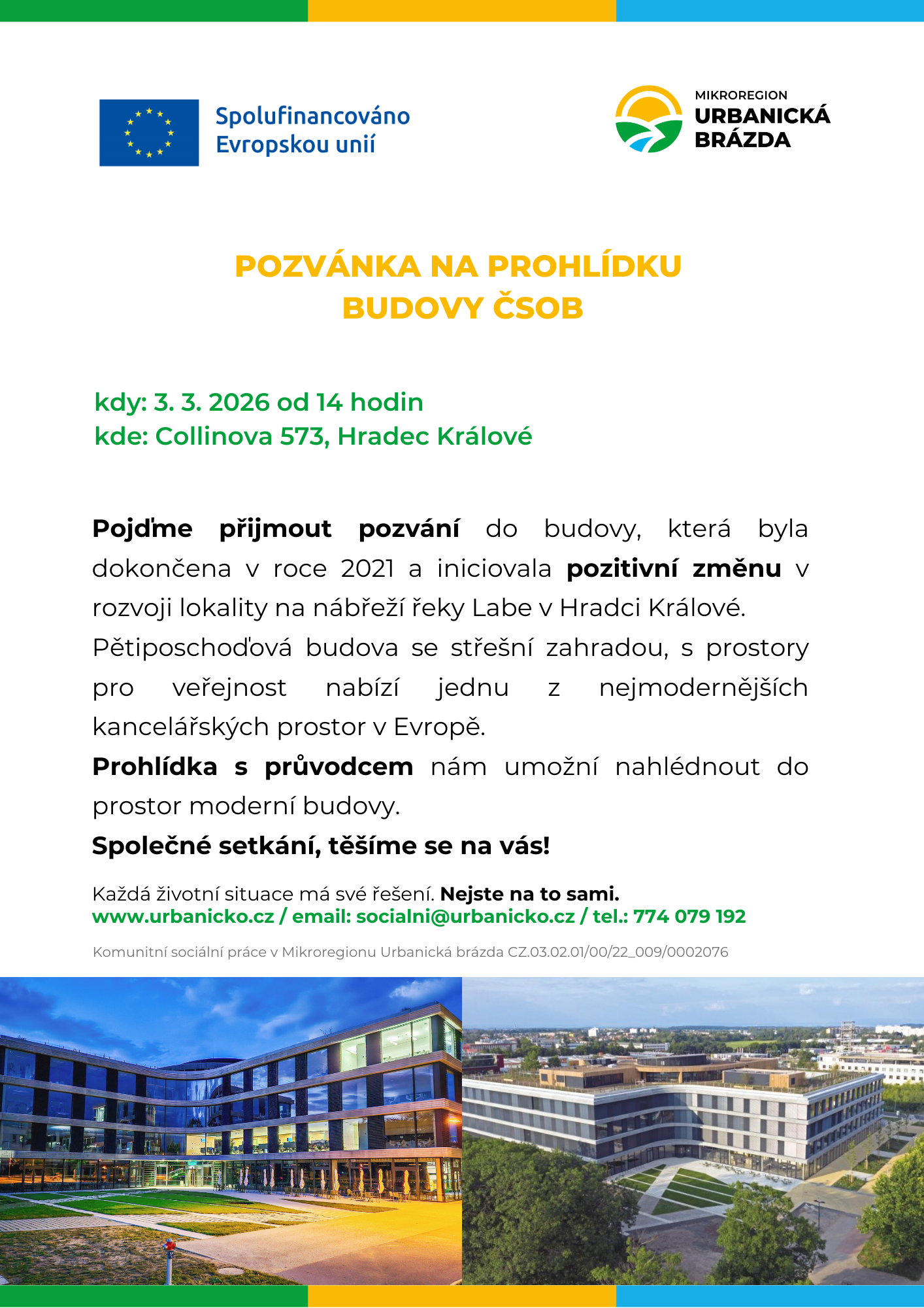 Mikroregion urbanická brázda vás srdečně zve na prohlídku budovy ČSOB v Collinově ulici v Hradci Králové. Akce se bude konat v úterý 3. března 2026 od 14.00 hodin. Podrobnosti naleznete v připojené pozvánce. Současně upozorňujeme, že na tuto akci je z důvodu omezené kapacity nutno se přihlásit u Ing. Kovářové, tel. 774 079 192.