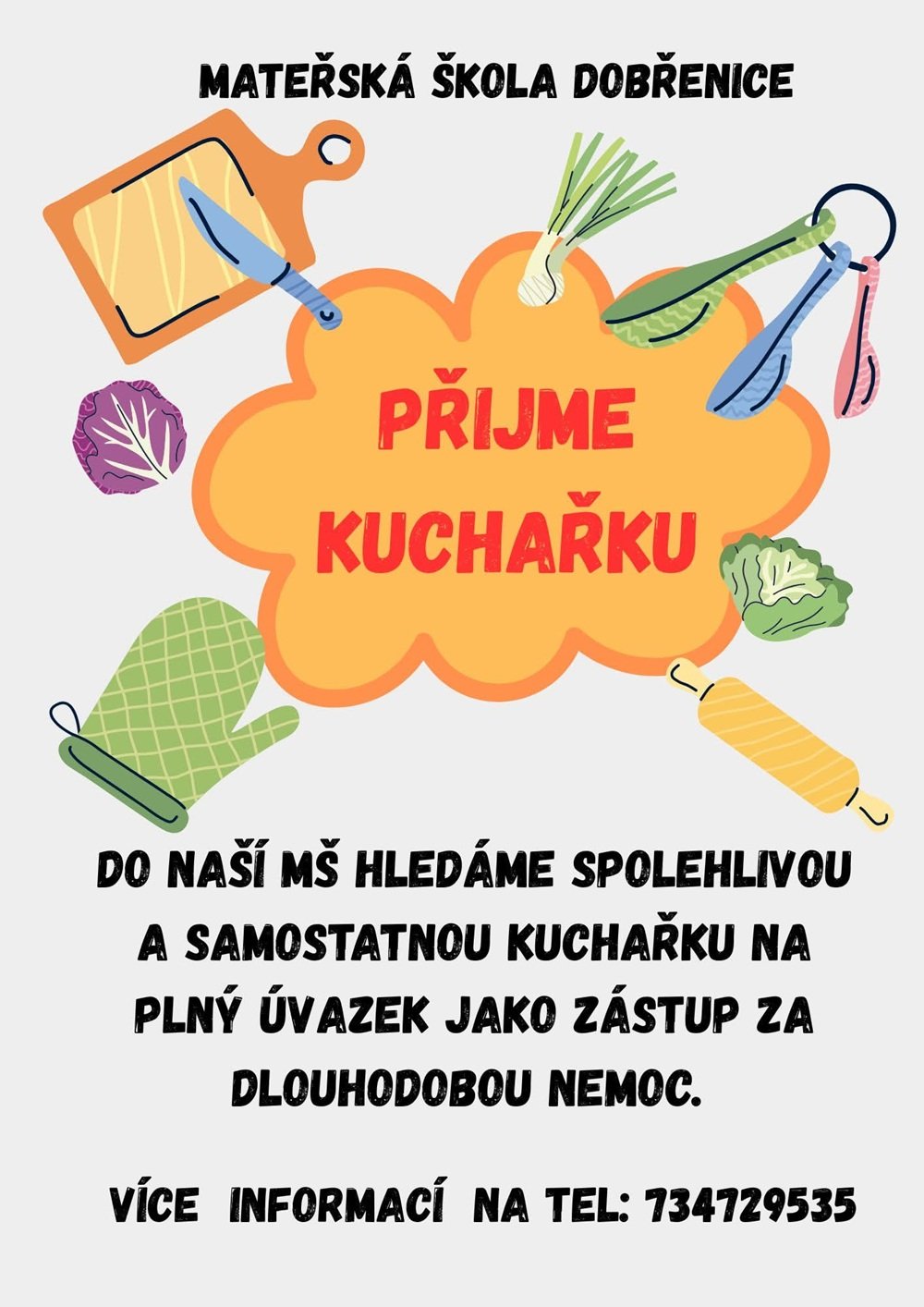 Do Mateřské školy v Dobřenicích se hledá kuchařka na plný úvazek. Podrobnější informace naleznete v připojeném letáku.